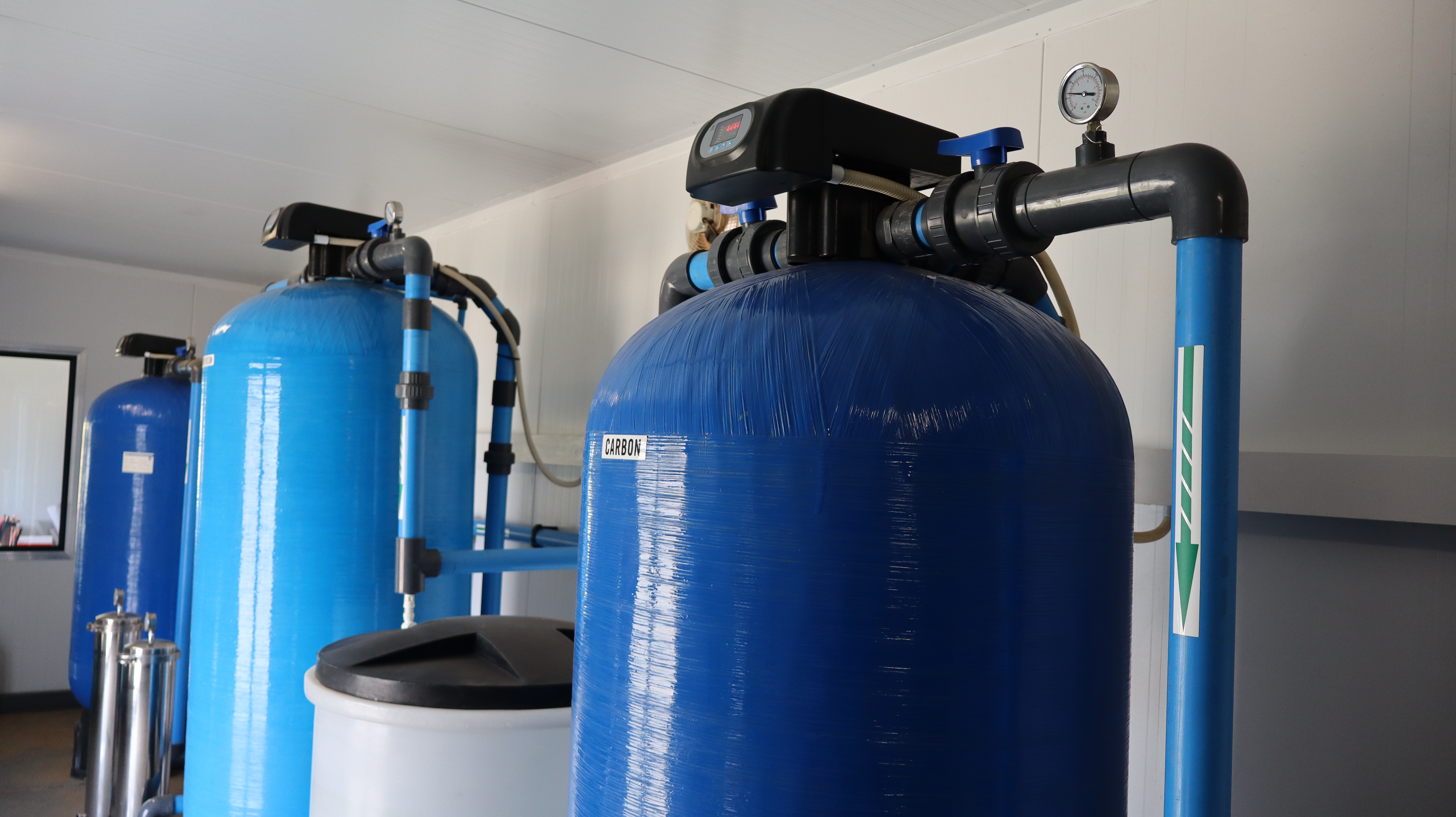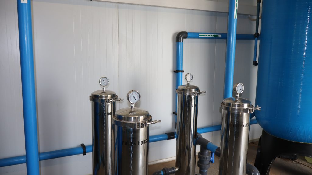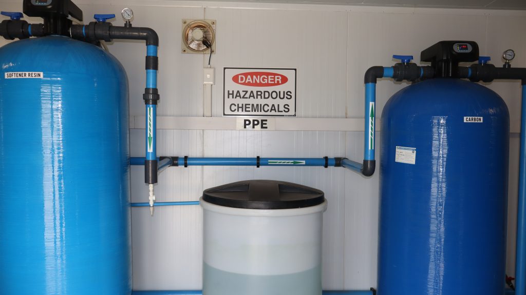 The system was designed based on water sample results to produce enough water to supply all the boreholes on the campus. The filtration system is made up of flocculation, pH balance, media filtration, filtration, and chlorine dioxide. The system is fully automated.